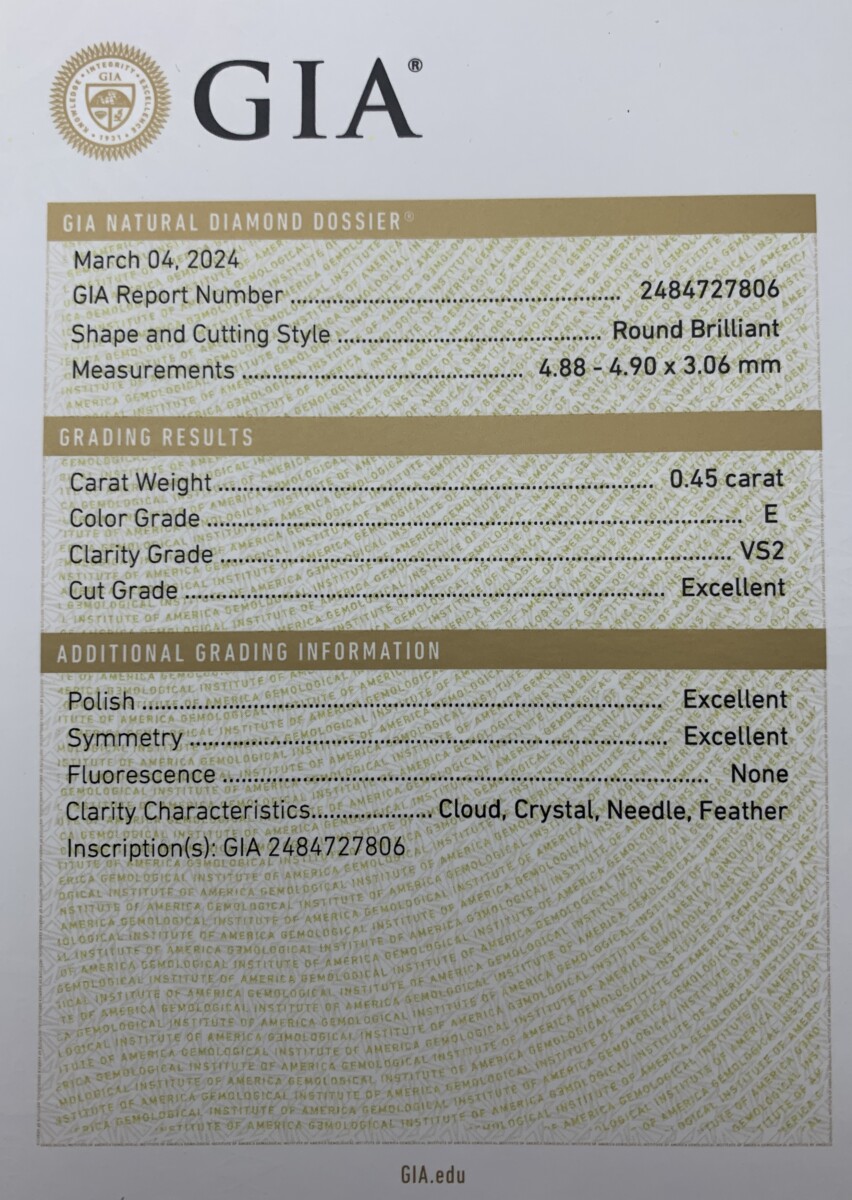 0.45 carat diamond, E color, VS2 clarity, accompanied by GIA international warranty certificate.