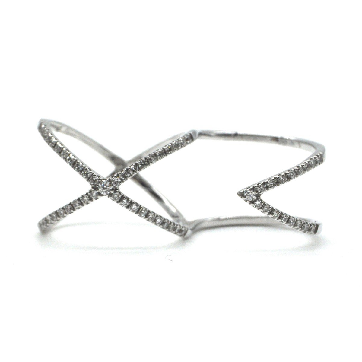 Ring with an exclusive design, handmade in our goldsmith goldshop in white gold 750 / °°°with brilliant cut diamonds, color G + clarity VS, with a total weight of 0.55 carats. The ring should be worn with the pointed part in the ring finger and the X in the middle finger. The height of the X along the finger is about 1.5 cm. In the sizes box indicate the size of the ring finger, in the notes indicate the size of your middle finger, so that we can send it to you already with the correct size.