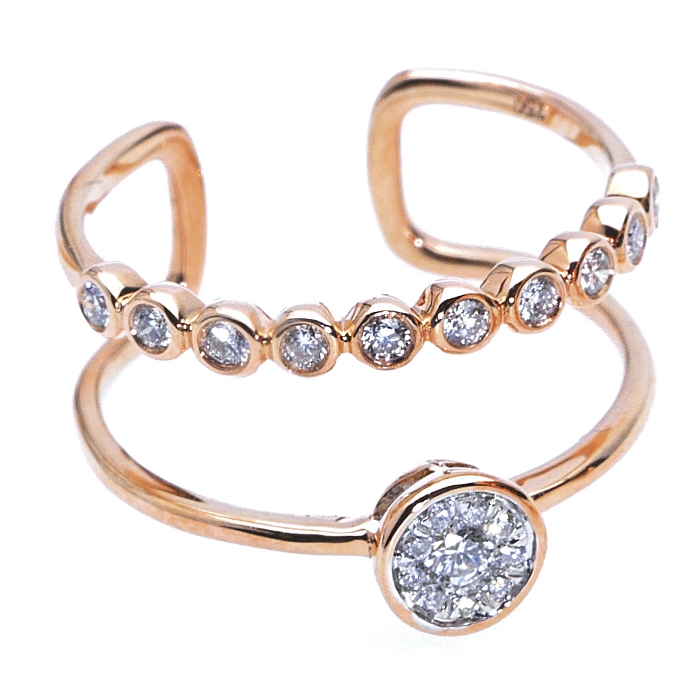 Ring with an exclusive design, handmade in our laboratory in red gold 750 / °°°, with brilliant cut diamonds with a total weight of 0.43 carats. The ring is about 1.2 cm high. Once worn the effect is to have two rings on your finger!
