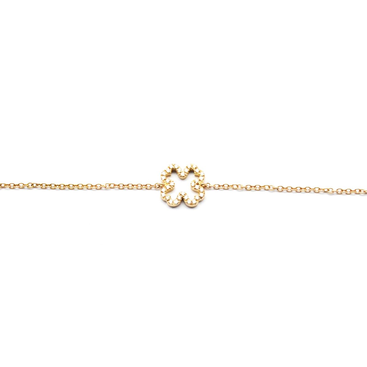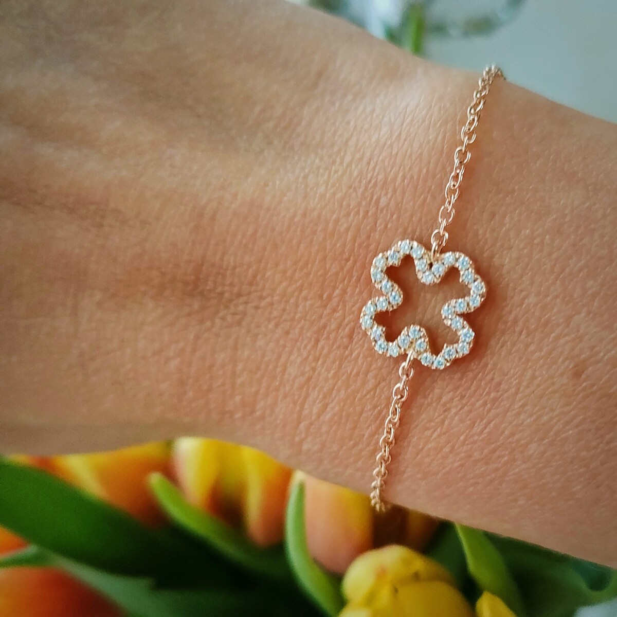 Bracelet in 750/°°° rose gold, handmade in our goldsmith’s workshop, with a central four-leaf clover set with natural brilliant-cut diamonds weighing a total of 0.19 carats.