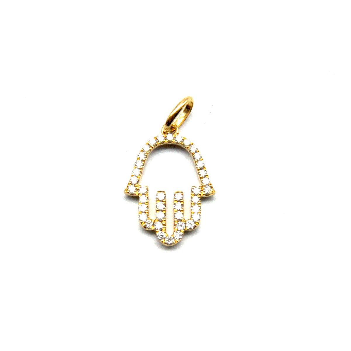 Pendant with an exclusive design in the shape of the hand of Fatima in 750/°°° yellow gold with natural brilliant cut diamonds weighing a total of 0.14 carats. The pendant has a height of approximately 1.2 cm and a width of approximately 1 cm.