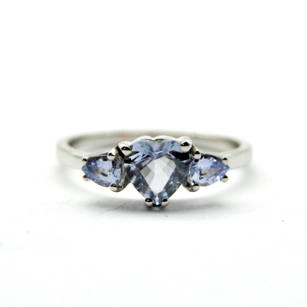 Ring handmade in our workshop in 750/°°° white gold with a central heart-cut natural sapphire and two pear-cut sapphires on the sides for a total weight of 1.17 carats.