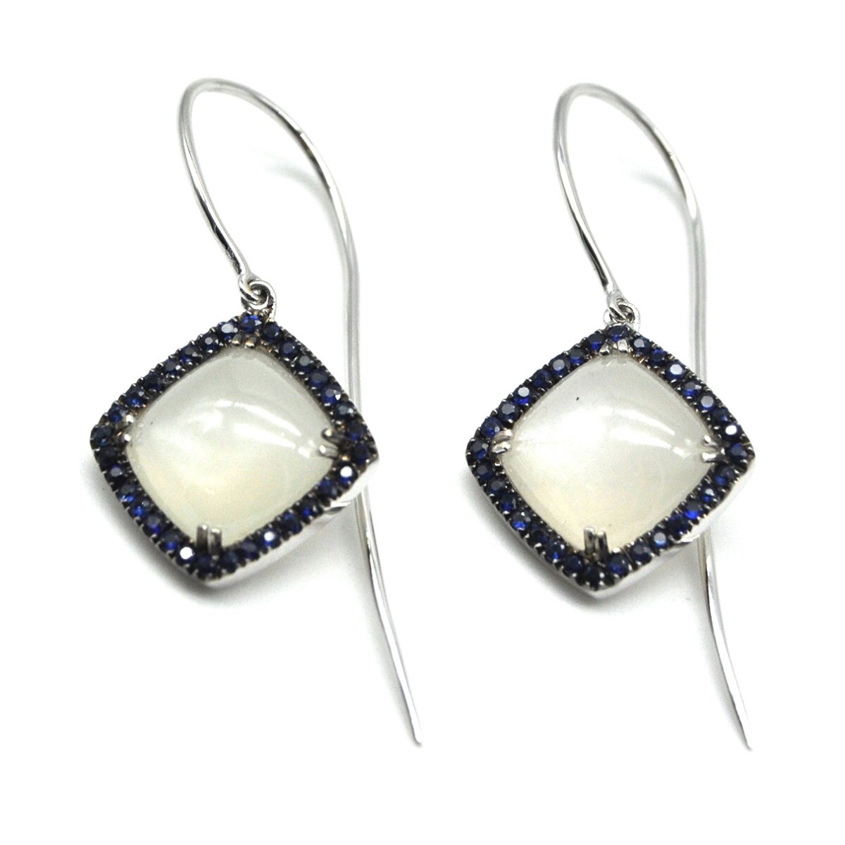 Marine hook earrings, handmade in our laboratory in 750/°°° white gold, with cabochon adularie and brilliant-cut blue sapphires with a total weight of 0.76 carats.