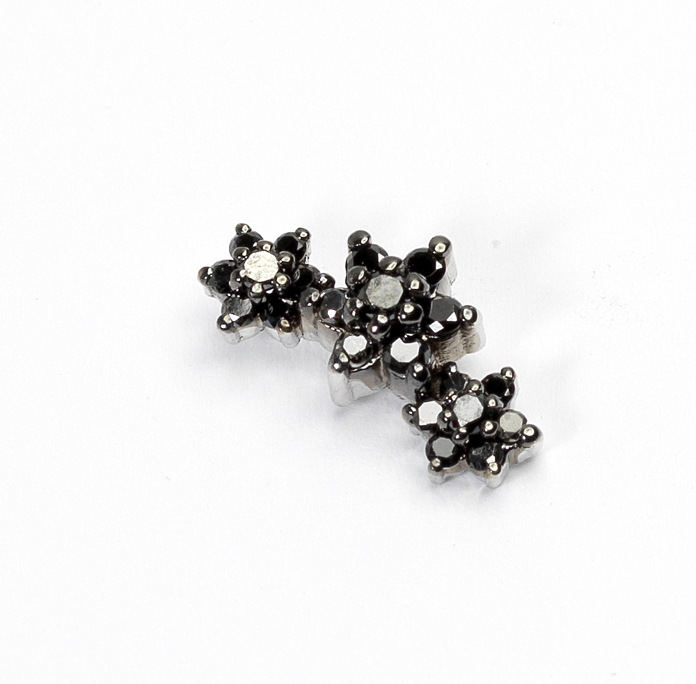 Earring handmade in our workshop in 750/°°° white gold and three brilliant-cut black diamond flowers with a total weight of 0.16 carats.
