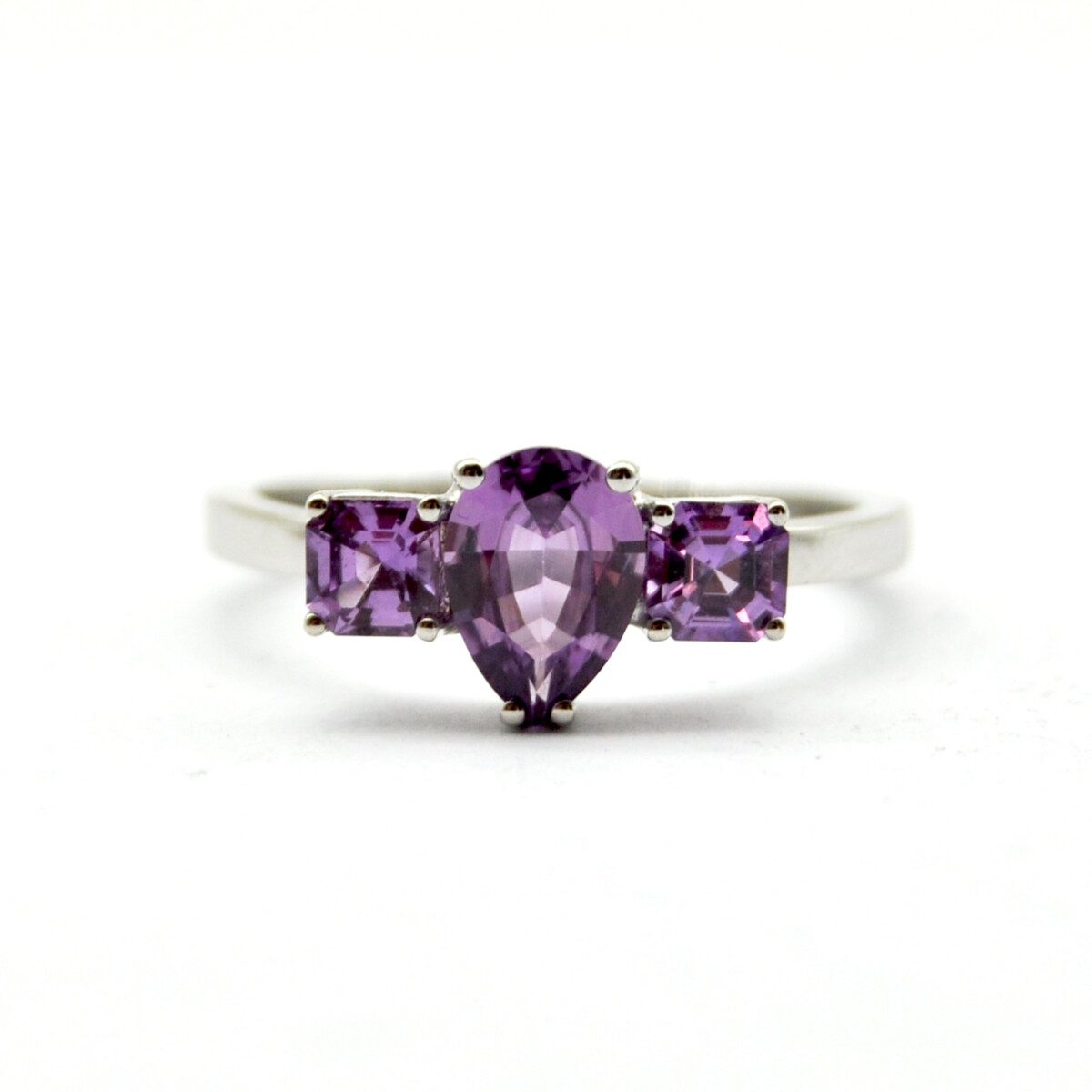 Violet ring with an exclusive design, handmade in our workshop in 750/°°° white gold with a natural pear-cut purple sapphire and two natural square-cut purple sapphires for a total weight of 1.18 carats.