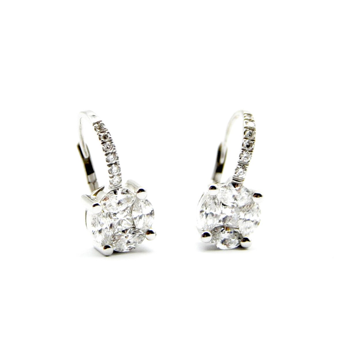 Leverback earrings handmade in our laboratory in 750/°°° white gold, with brilliant-cut diamonds with a total weight of 0.14 carats, navette-cut diamonds with a total weight of 1.096 carats and princess-cut diamonds with a total weight of 0.277 carats.