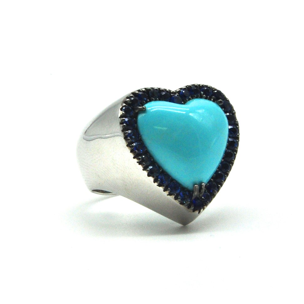 Ring with an exclusive design, handmade in our laboratory in white gold 750 / °°° , heart-shaped turquoise cabochon and contour of brilliant cut blue sapphires with a total weight of 0.84 carats.