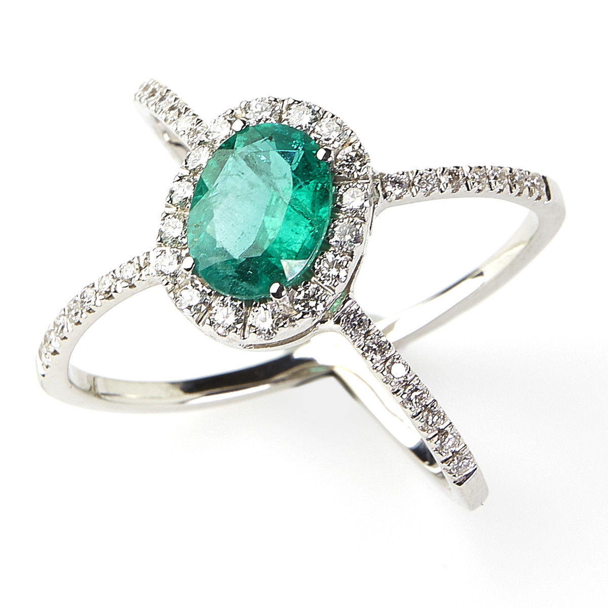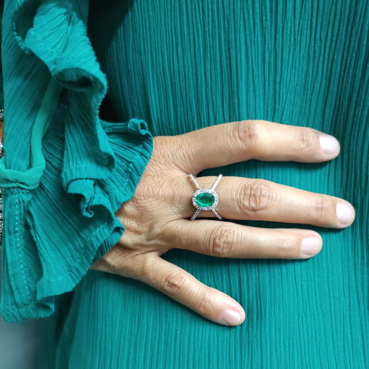 Ring handmade in our laboratory in 750 / °°° white gold with an oval emerald weighing 1.19 carats and brilliant cut diamonds weighing a total of 0.41 carats.