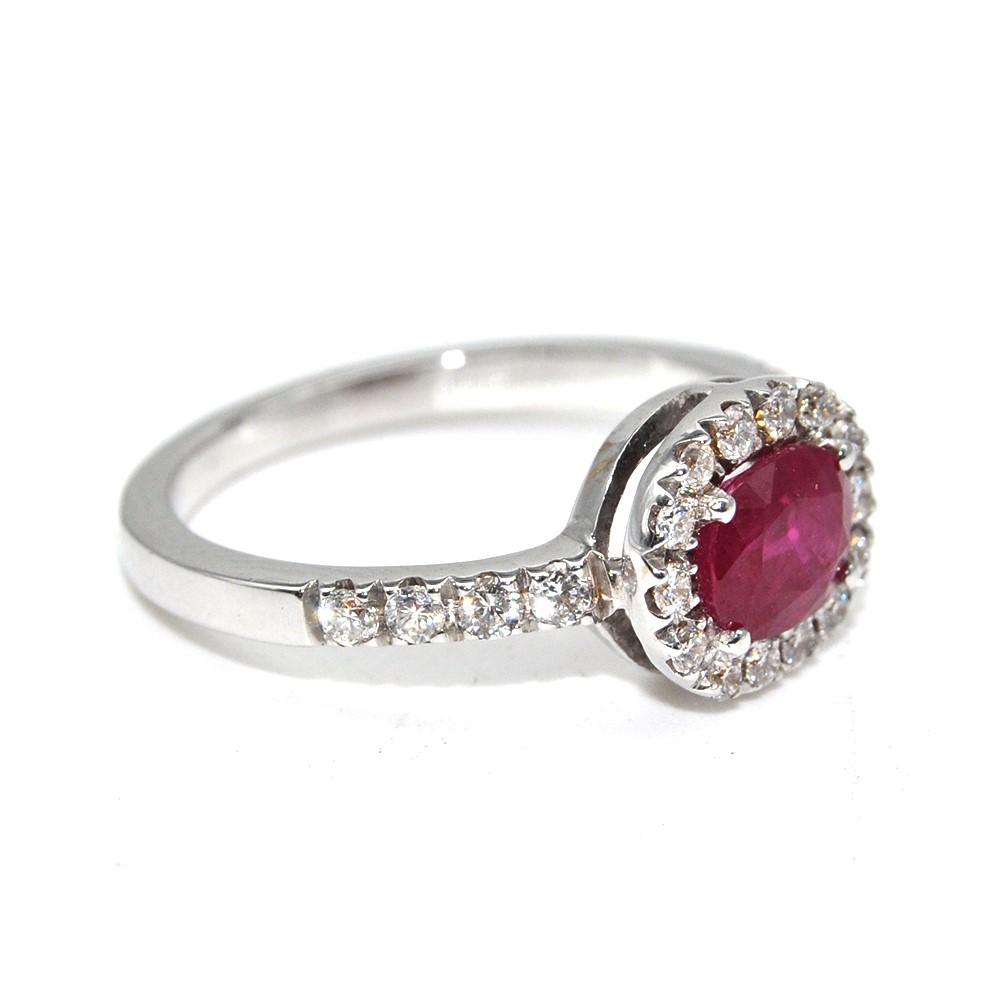 Ring with an exclusive design, handmade in our laboratory in white gold 750 / °°°with central ruby with a total weight of 1.08 carats and brilliant cut diamonds weighing 0.35 carats.