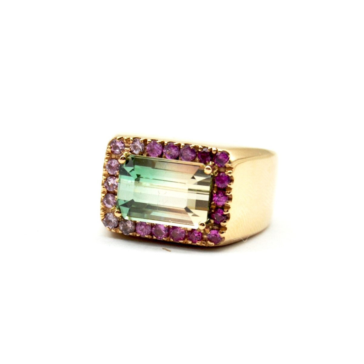 Anello dal deisgn esclusivo realizzato a mano presso il nostro laboratorio in oro rosa titolo 750/°°° con tormalina watermelon naturale taglio smeraldo del peso di 4,22 carati e zaffiri rosa sfumati naturali taglio brillante del peso complessivo di 0,60 carati.