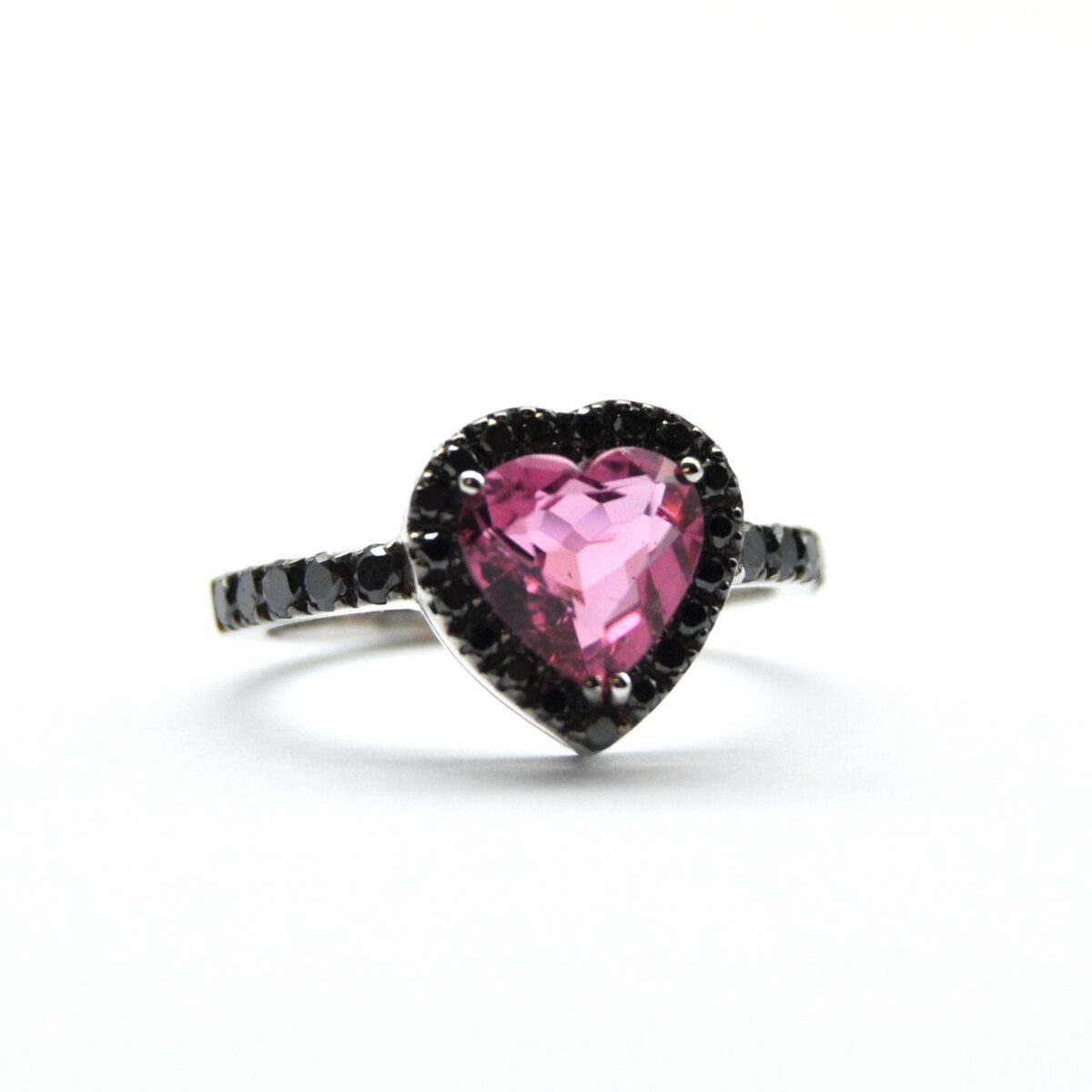 Anello in oro bianco titolo 750/°°° realizzato a mano presso il nostro laboratorio orafo, con tormalina rossa taglio cuore del peso di 1,44 carati e diamanti neri taglio brillante del peso complessivo di 0,47 carati.