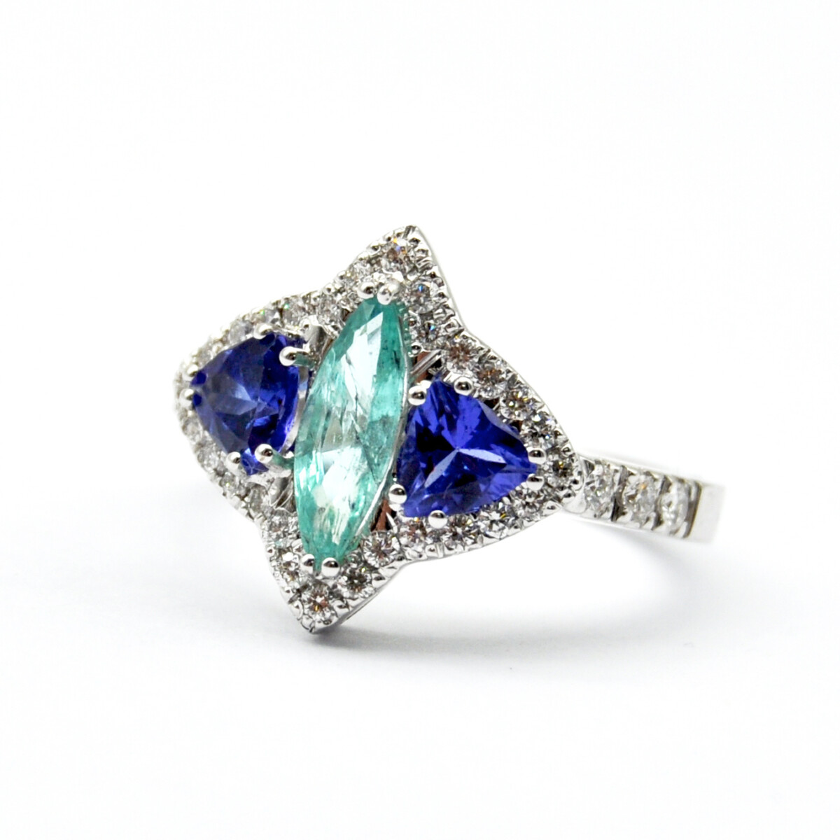 Anello dal deisgn esclusivo realizzato a mano presso il nostro laboratorio in oro bianco titolo 750/°°° con tormalina paraiba naturale provenienza Mozambico taglio navette del peso di 0,74 carati, due tanzaniti naturali taglio trilliant del peso complessivo di 0,93 carati e diamanti naturali taglio brillante del peso complessivo di 0,30 carati.