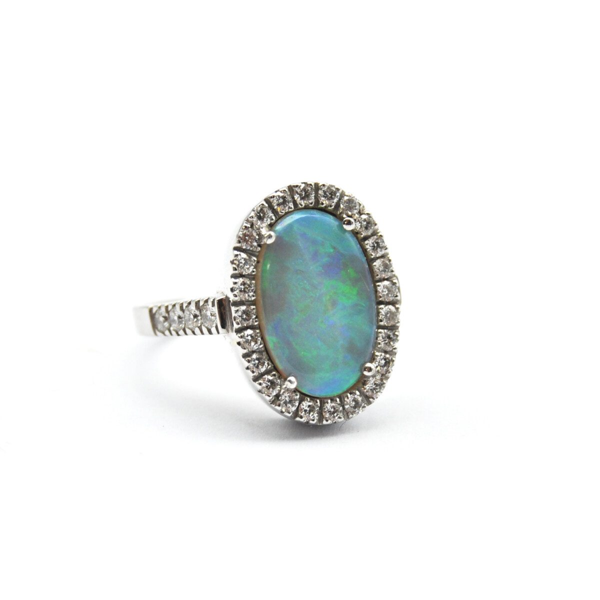 Anello in oro bianco titolo 750/°°° realizzato a mano presso il nostro laboratorio orafo, con opale australiano taglio ovale del peso di 2,63 carati e diamanti taglio brillante del peso complessivo di 0,61 carati.