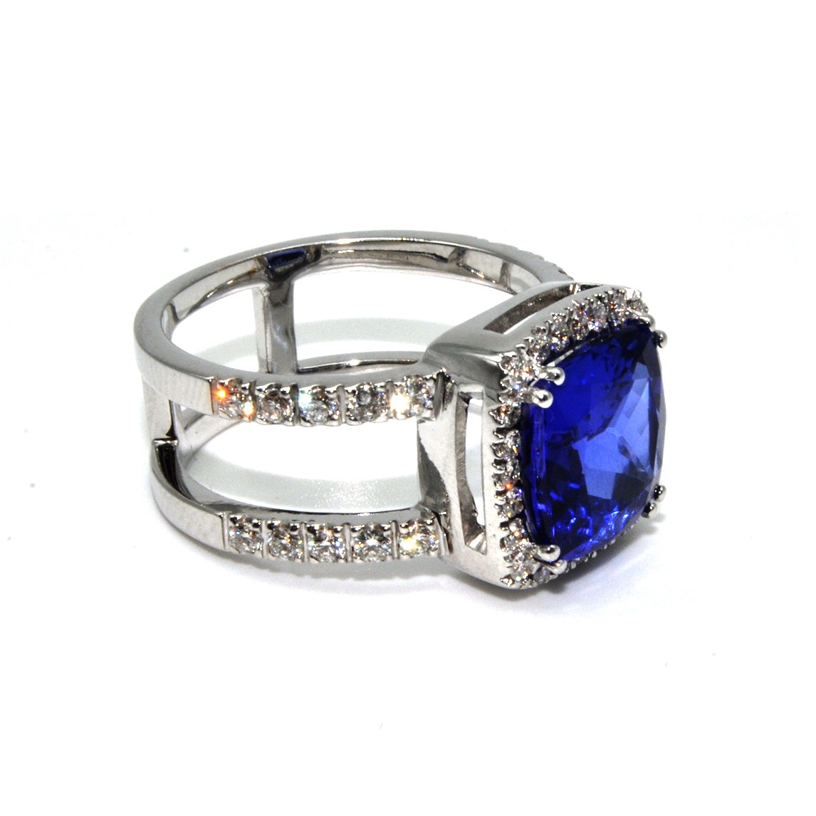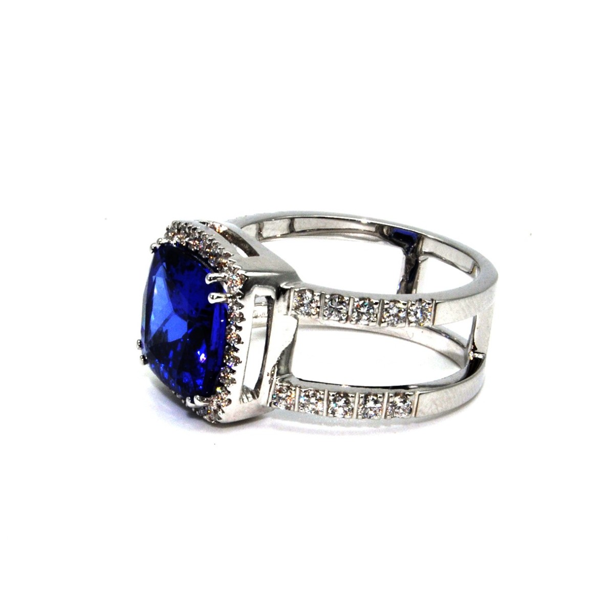 Anello realizzato a mano presso il nostro laboratorio in oro bianco titolo 750/°°° tanzanite taglio cushion dal peso di 4,13 carati e diamanti taglio brillante per un peso complessivo di 0,59 carati.