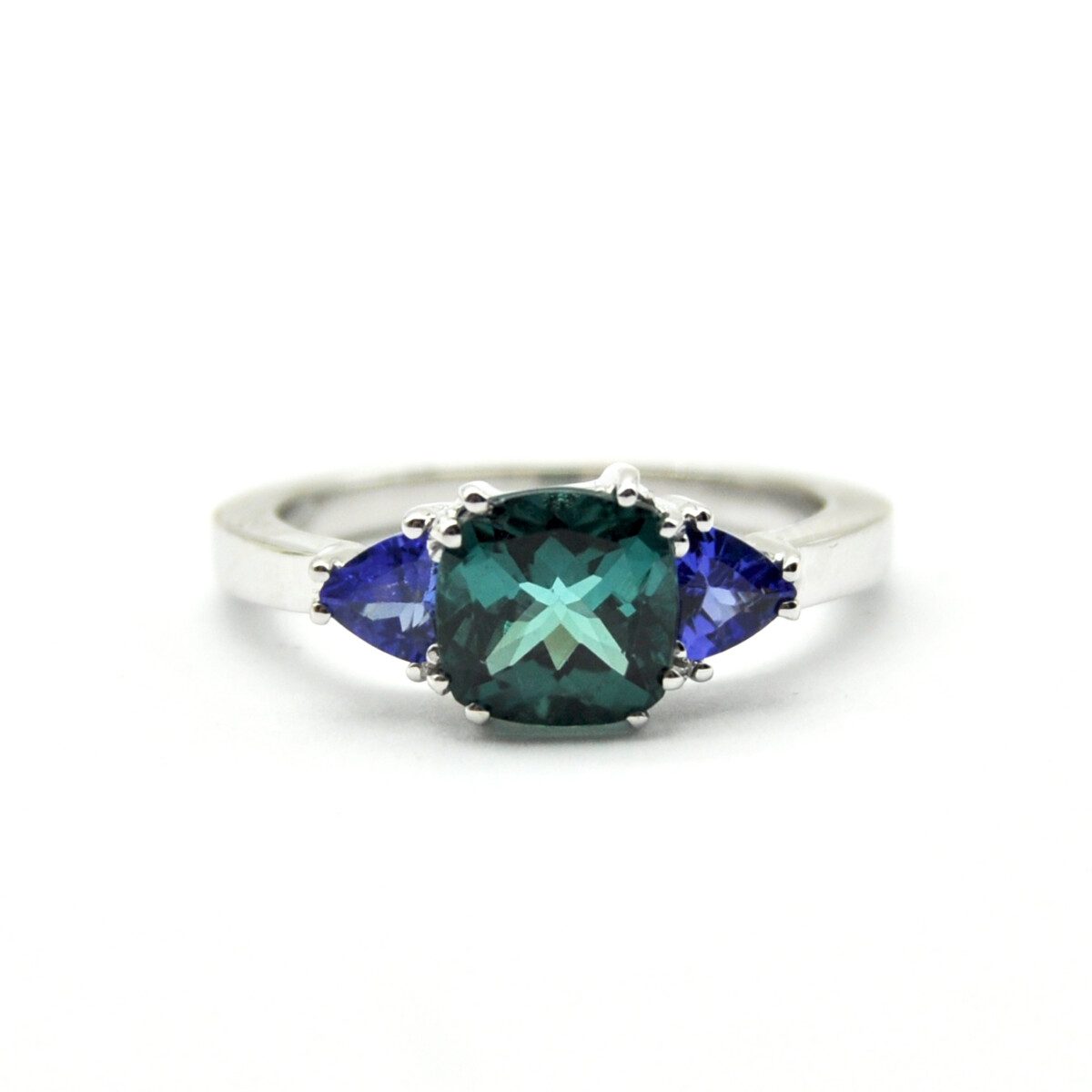 Anello dal design esclusivo realizzato a mano presso il nostro laboratorio in oro bianco titolo 750/°°° con uno tormalina blue lagoon naturale taglio cushion del peso di 1,31 carati e due tanzaniti naturali taglio trilliant del peso complessivo di 0,42 carati.