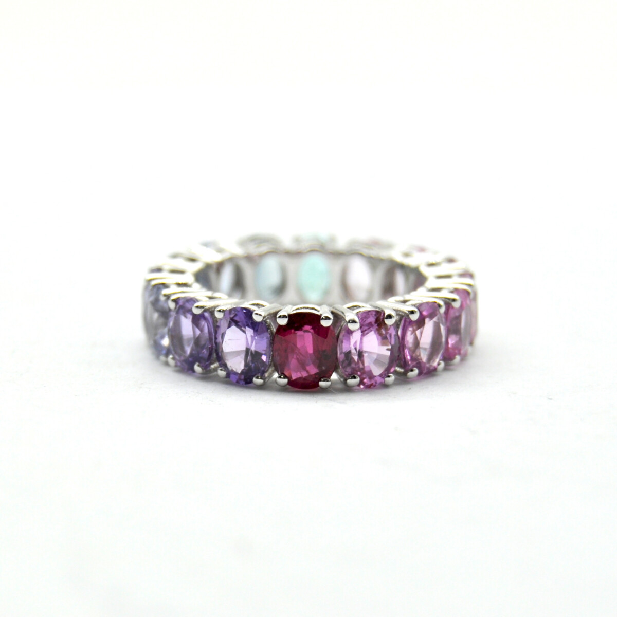 Fedina Rainbow dal deisgn esclusivo realizzato a mano presso il nostro laboratorio in oro bianco titolo 750/°°° con zaffiri naturali colorati sfumati taglio ovale del peso complessivo di 8,41 carati, un rubino naturale taglio ovale del peso di 0,59 carati e una tormalina Paraiba naturale taglio ovale del peso di 0,48 carati.