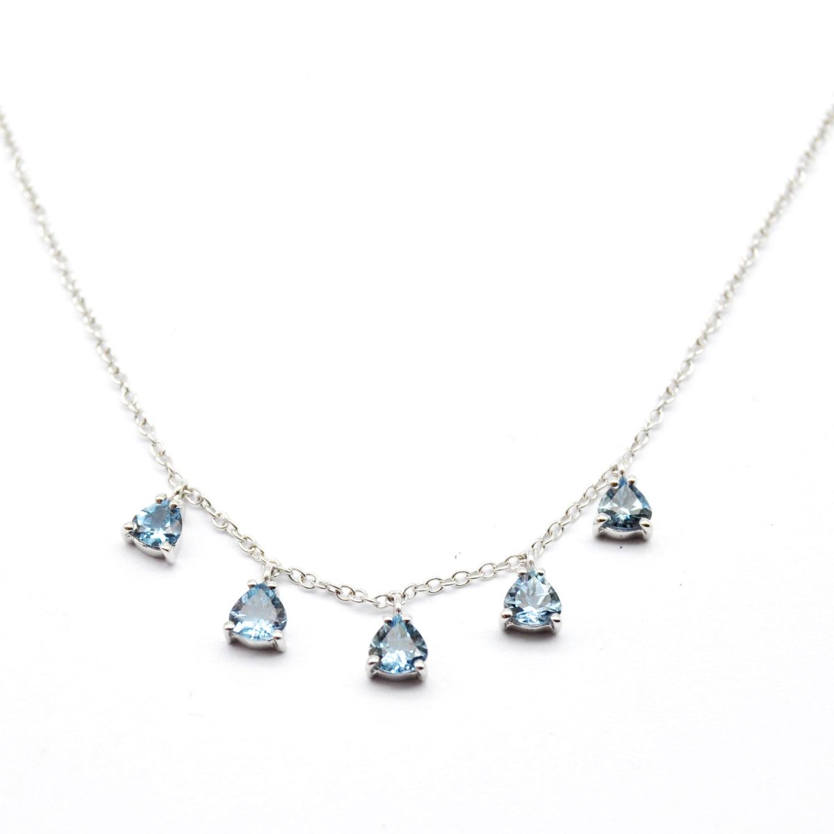 Girocollo dal design esclusivo, realizzato a mano presso il nostro laboratorio, in oro bianco titolo 750/°°°, con cinque acquemarine taglio goccia dal peso complessivo di 0,97 carati.