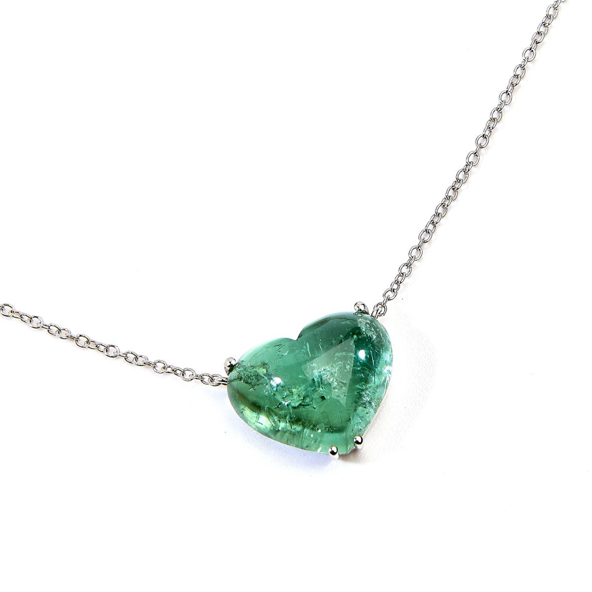 Girocollo realizzato a mano in oro bianco titolo 750/°°° con tormalina taglio cuore verde cabochon