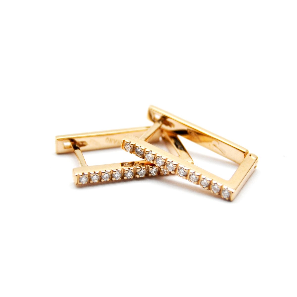 Orecchini rettangolari realizzati a mano presso il nostro laboratorio in oro rosa titolo 750/°°° con diamanti taglio brillante dal peso complessivo di 0,19 carati.